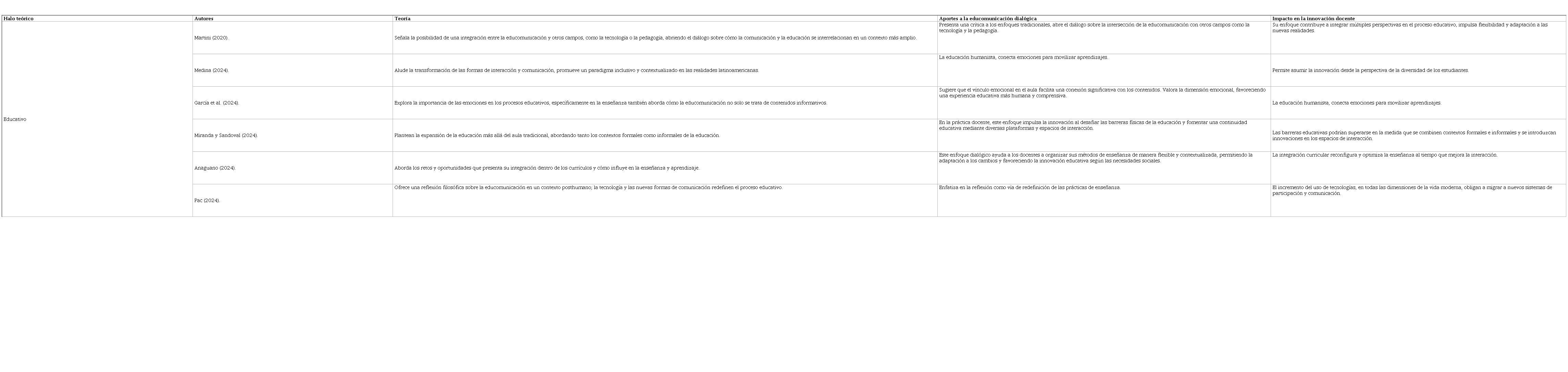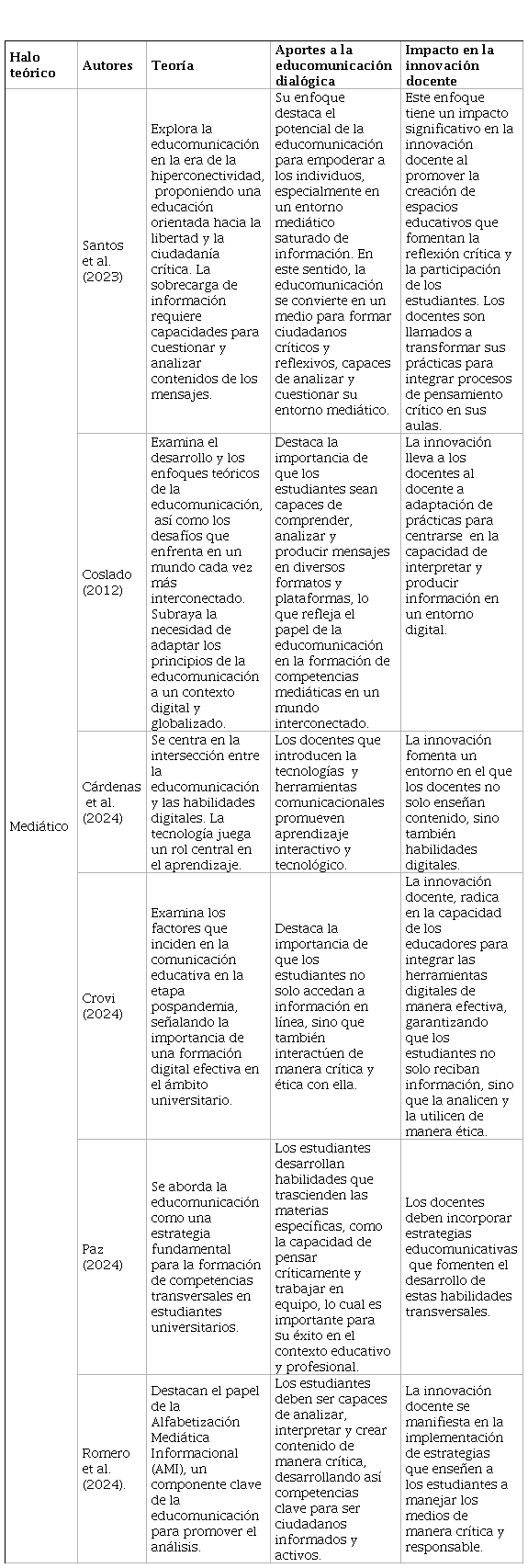 La Tabla 1 presenta la perspectiva educativa desde el enfoque de varios autores. En este sentido, Martini (2020) considera que la educomunicación se presenta como una crítica a los enfoques tradicionales, destacando su potencial para integrar y dialogar con otros campos como la tecnología y la pedagogía. Esta intersección abre un espacio para que la educomunicación impulse prácticas docentes más flexibles y adaptativas, lo cual responde a las demandas cambiantes de la sociedad contemporánea. Su enfoque dialógico permite una mayor variedad de perspectivas, propiciando una enseñanza que no solo se adapta al cambio, sino que también desafía a los educadores a cuestionar y renovar constantemente sus métodos.