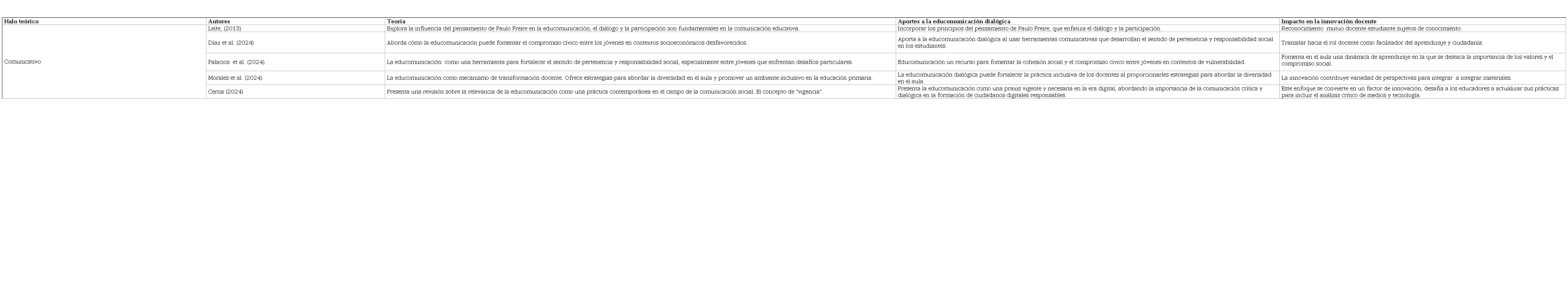 La Tabla 2 presenta información sobre el halo comunicativo, observándose que la educomunicación se consolida como un enfoque dialógico fundamental en la innovación de la práctica docente, permitiendo que la educación evolucione hacia un proceso colaborativo y crítico. Citando a autores en la teoría y práctica educomunicativa, es posible identificar cinco enfoques fundamentales —comunicativo, cívico, inclusivo, de pertenencia y de transformación digital— que aportan perspectivas únicas y complementarias sobre cómo la educomunicación puede revolucionar el rol docente y el aprendizaje en el aula.