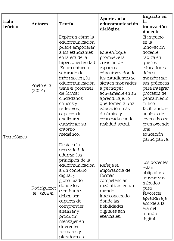 La Tabla 4 presenta un enfoque tecnológico Prieto et al. (2024) mencionan cómo la educomunicación, en un contexto de hiperconectividad, puede empoderar a los estudiantes, ayudándoles a convertirse en ciudadanos críticos y reflexivos que analicen y cuestionen activamente su entorno mediático. Este enfoque no solo subraya la importancia de la reflexión crítica, sino también la participación activa en el proceso de aprendizaje, lo cual se convierte en una estrategia para conectar la educación con la realidad social contemporánea. Los docentes, en este contexto, deben transformar sus prácticas educativas para integrar el pensamiento crítico y el análisis de los medios de comunicación, lo que no solo facilita el aprendizaje, sino que promueve la formación de individuos más comprometidos con su entorno.