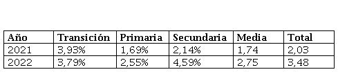 La disminución de las tasas de repitencia escolar es un componente crucial para prevenir la deserción escolar. La etapa de transición entre grados es concluyente, y es necesario implementar estrategias de permanencia para esta población.