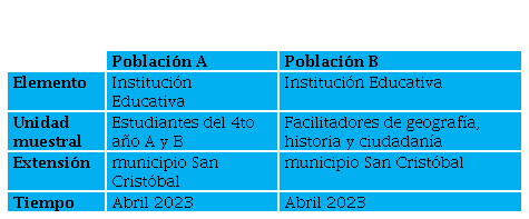 La población estuvo constituida por estudiantes de 4º año de educación media general (secciones A = 33 estudiantes y B= 32 estudiantes), con un total de 65 alumnos inscritos según datos suministrados por la dirección de la institución y por los dos facilitadores responsables de la asignatura. La definición de la población siguió los criterios de Malhotra (2016). En cuanto a la muestra, se empleó un muestreo intencional (Sabino, 2010), tomando la totalidad de la población: 65 estudiantes y 2 docentes (muestra censal). Esta decisión permitió abarcar todas las unidades de análisis relevantes para los objetivos del estudio.