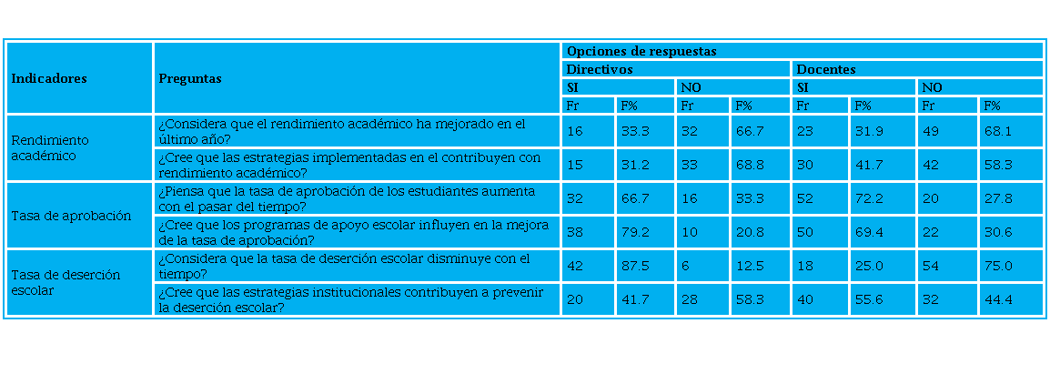 De allí que los resultados muestran una percepción mixta sobre los indicadores analizados. Aunque se destacan avances en la tasa de aprobación, persisten desafíos significativos en el rendimiento académico y la prevención de la deserción escolar. Es fundamental revisar las estrategias actuales, fomentar el diálogo entre directivos y docentes, y reforzar las iniciativas exitosas para lograr un impacto positivo y sostenible en los estudiantes.