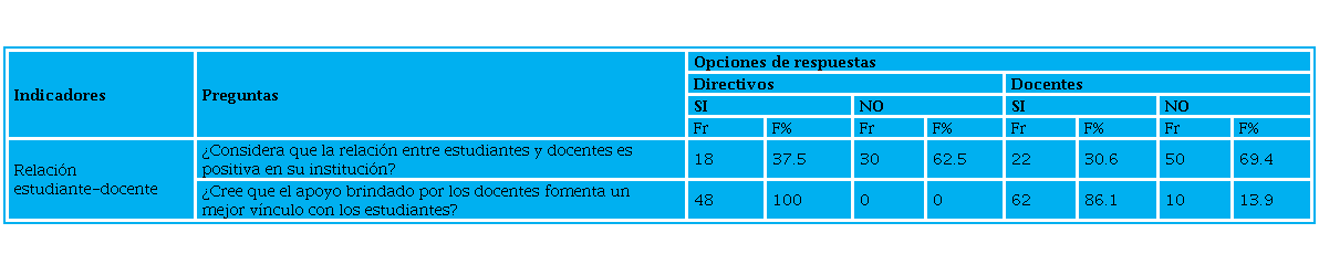 La Tabla 2, muestra los resultados de los indicadores de eficiencia administrativa, en cuanto al indicador relación estudiante-docente se muestra percepciones contrastantes entre directivos y docentes. Solo el 37.5% de los directivos considera que la relación es positiva, mientras que el 62.5% cree que no lo es. Entre los docentes, esta percepción es aún más negativa, con un 30.6% que evalúa la relación positivamente y un 69.4% que no. Sin embargo, existe un consenso alentador sobre el apoyo brindado por los docentes, ya que el 100% de los directivos y el 86.1% de los docentes reconocen que este factor contribuye a fortalecer los vínculos con los estudiantes. Estos datos reflejan que, aunque las relaciones generales pueden ser vistas como deficientes, las acciones individuales de los docentes tienen un impacto positivo, lo cual destaca la importancia de fortalecer estas prácticas y promover una mayor interacción positiva en el entorno institucional.