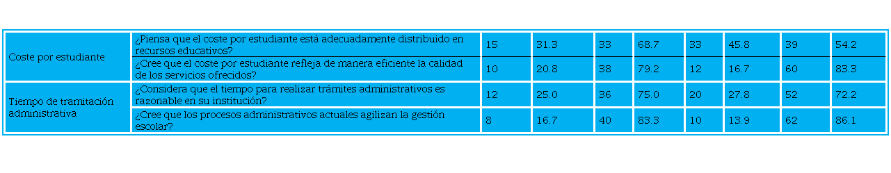 Los resultados indican que las instituciones educativas enfrentan retos significativos en cuanto a la mejora de las relaciones entre estudiantes y docentes, la distribución y eficiencia del coste por estudiante y la optimización de los procesos administrativos. Estos resultados señalan áreas importantes para intervenir, implementando estrategias que promuevan un ambiente escolar más positivo, una gestión financiera más transparente y efectiva, y una administración más ágil que permita un mejor desempeño de la comunidad educativa en su conjunto.