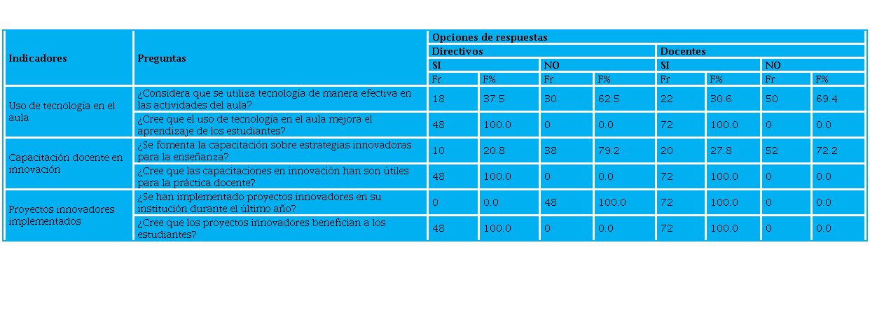 La Tabla 3, muestra los resultados de los Indicadores de Innovación Educativa, observándose en cuanto al uso de tecnología en el aula, se observa que solo el 37.5% de los directivos considera que la tecnología se utiliza de manera efectiva en las actividades del aula, mientras que el 62.5% no está de acuerdo. Mientras que el un 69.4% de los directivos considera que esto sucede así y un 30.6% considera que si ocurre- Entre los docentes, la percepción es más optimista, aunque aún preocupante, ya que solo el 50% considera que la tecnología se emplea adecuadamente. Sin embargo, tanto directivos como docentes coinciden en que el uso de tecnología mejora el aprendizaje de los estudiantes, con un 100% de respuestas afirmativas. Esto destaca una paradoja: aunque la implementación podría no ser óptima, existe un consenso sobre el potencial positivo de la tecnología en el proceso educativo.
