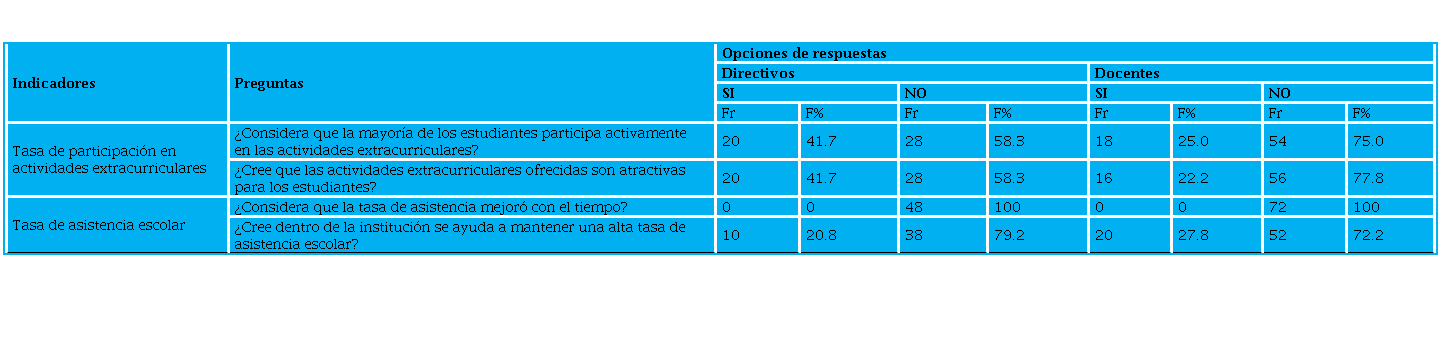 La Tabla 4 muestra los resultados de los indicadores de bienestar estudiantil, observándose en lo referente a la tasa de participación en actividades extracurriculares, los directivos tienen una percepción dividida: el 41.7% considera que la mayoría de los estudiantes participa activamente en estas actividades, mientras que el 58.3% no lo cree. Entre los docentes, la percepción es más negativa, ya que solo el 25% considera que los estudiantes participan activamente, mientras que el 75% señala lo contrario. Además, respecto a si las actividades extracurriculares ofrecidas son atractivas para los estudiantes, un porcentaje similar de los directivos (41.7%) opina afirmativamente, aunque no se reporta un porcentaje claro entre los docentes. Estos datos sugieren la necesidad de evaluar y rediseñar las actividades extracurriculares para hacerlas más inclusivas y motivadoras, de manera que logren captar el interés de un mayor número de estudiantes.