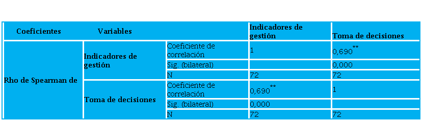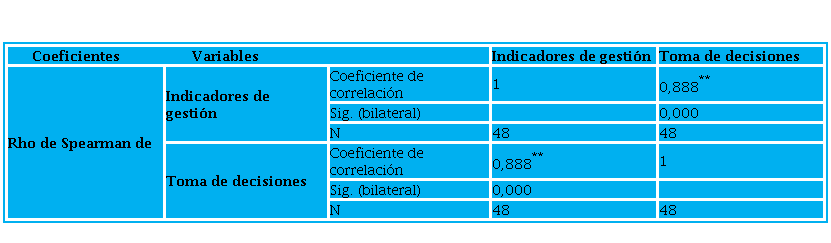 Coeficiente de correlación entre los indicadores de gestión y la toma de decisiones según directivos
