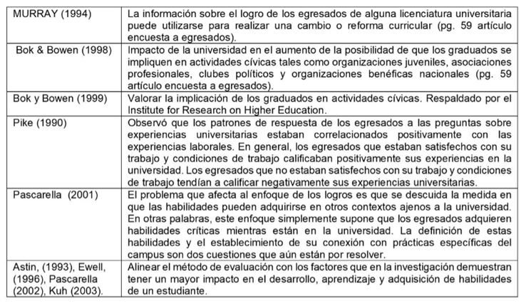 En la tabla 1 se presentan las conclusiones de cinco trabajos de investigación sobre el seguimiento a egresados de diversas universidades. Esto permite observar como las líneas de investigación están orientadas a generar información para justificar cambios en el mapa curricular.
