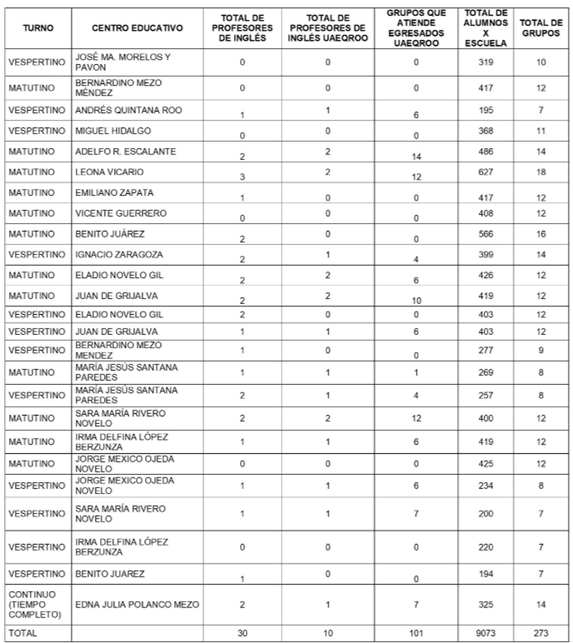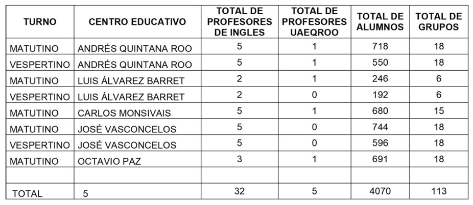 Por tal motivo, para determinar el desempeño de los profesores de inglés egresados de Lengua Inglesa es importante analizar en qué escuelas y turnos se encuentran laborando, la cantidad de alumnos y grupos que cada uno atiende y cuantos son los egresados que laboran en el sistema educativo.