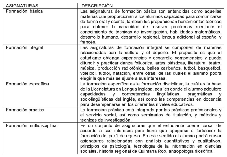 La formación específica o disciplinar representa el 73.25% del conjunto de experiencias de aprendizaje para formar las competencias relacionadas con el perfil de egreso como docente de inglés. Este se compone de asignaturas que involucran la formación docente que comparadas con otros programas, como el de las escuelas normales, la de Lengua Inglesa está limitada a la práctica docente 1 y 2. Y las materias para la formación en lenguas están alienadas a obtener un nivel avanzado de inglés, lo cual resulta una de las fortalezas del programa, por lo tanto, derivado de los resultados estadísticos que muestran que la mayor demanda de profesores de inglés están en los niveles básicos, será de importancia que la UAEQROO considere incluir asignaturas que aborden temas de la Nueva Escuela Mexicana.