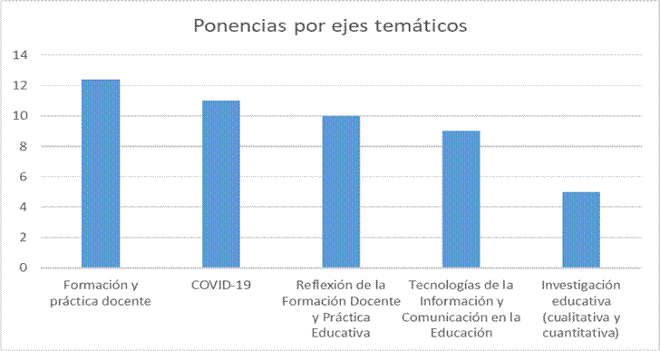 Con esta información se procedió al análisis estadístico para identificar la mayor frecuencia de ponencias por ejes temáticos y la mayor cantidad de ponencias por líneas de investigación de acuerdo con cada Cuerpo Académico de las Redes de Investigación Educativa participantes.