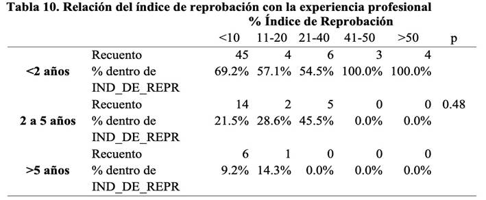 Para la relación del índice de reprobación con la experiencia profesional, se realizó la prueba estadística de chi-cuadrada, obteniendo un valor de p de 0.48, siendo este un valor estadísticamente no significativo.