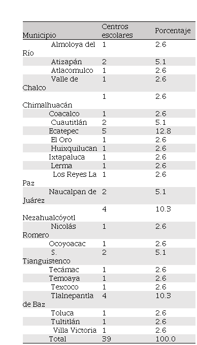 En la determinación de la muestra se empleó la técnica del método no probabilístico intencional, en donde (Otzen & Manterola, 2017) menciona que este tipo de método permite seleccionar casos característicos de una población especialmente por su accesibilidad. La justificación del empleo de esta técnica, radica en la intención que tiene la institución educativa en obtener información importante sobre sus planes de mejora. Para ello, participaron los 39 centros escolares del tipo profesional técnico de la educación media superior distribuidos en el territorio del Estado de México. En la tabla I, se presenta la distribución de la muestra.