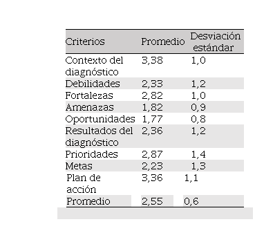 La puntuación media obtenida en el instrumento de evaluación es de 2,55, lo que indica una calidad generalizada como “satisfactoria”, es decir, los planes de mejora continua cumplen con lo mínimo establecido por la rúbrica de evaluación. Como se puede apreciar en la tabla 4, en promedio ningún criterio de evaluación ocupó el nivel de “excelente”, los criterios de análisis del contexto y el plan de acción ocuparon el nivel de “bueno”, las debilidades, fortalezas, resultado del diagnóstico, prioridades y metas, se ubican en el nivel “satisfactorio”, y amenazas y oportunidades se ubican en el nivel “insatisfactorio”. Reforzando la evaluación de los datos cuantitativos con las observaciones realizadas durante evaluación se interpreta los siguiente:
