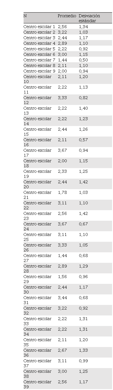 Como se mencionó la muestra contempló a un total de 39 centros escolares, la tabla V indica los resultados obtenidos por cada uno de ellos.