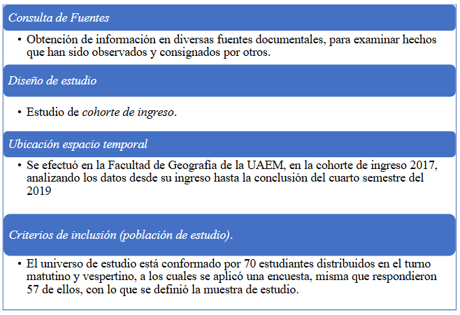Diseño de estudio. Por la integración de los sujetos de observación se trata de un estudio de cohorte de ingreso. La cohorte o unidad de observación quedó así determinada por todos aquellos estudiantes que presentaron examen de admisión para ingresar a la Licenciatura en Geografía y que se corresponde con el Plan de Estudios 2017.