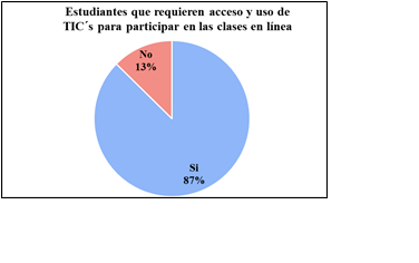 A grandes rasgos, se asumió que todos los estudiantes tendrían acceso y uso de las TIC para aplicarlas en sus procesos de aprendizaje; sin embargo, la realidad demostró que solo 2 de cada 10 estudiantes de licenciatura tenían esa restricción, por lo que se consideraba que esos estudiantes que tenían esa restricción se apoyarían en sus compañeros que podrían accesar a las clases virtuales sin problema; aun y que se reconocía que el 87% de los estudiantes requerirían el uso y acceso de las TIC para llevar a cabo las clases virtuales.