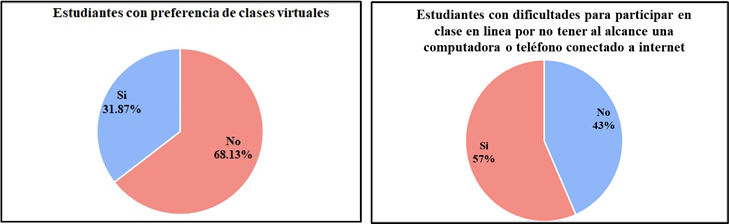 No obstante, casi 6 de cada 10 estudiantes revelaron dificultades para accesar a las clases virtuales debido a baja capacidad el ancho de banda de las localidades donde residen o en su caso por la falta de equipo de cómputo, conformándose con usar su teléfono celular, lo que no garantizaría un uso adecuado para desarrollar las clases virtuales, debido a la visibilidad y audio limitado que ofrece una pequeña pantalla de un teléfono móvil.