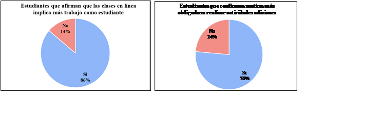 Puede entenderse que la mayoría de los estudiantes (68.13%) prefiere las clases presenciales en lugar de las clases virtuales (31.87%), debido a que la mayoría (86%) afirman que las clases en línea implica más trabajo como estudiantes (Ver gráfica 4), además que el asumir su roll de estudiante, ya que sienten más obligados a realizar actividades adicionales. Así lo expresa el 76% de los estudiantes consultados (Ver gráfica 5).
