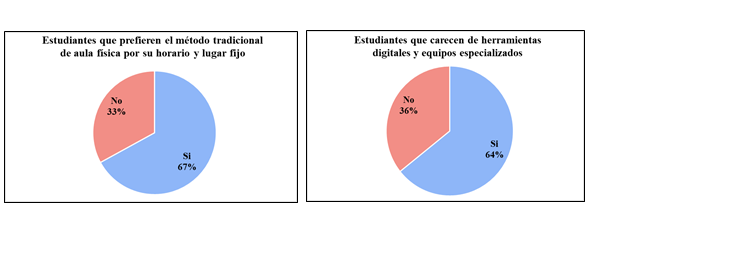 Por una parte, en la gráfica 6 se aprecia que la mayoría de los estudiantes (67%) prefieren las clases tradicionales en el aula física debido a que se mantiene un horario y lugar fijo, lo que les permite organizar el resto del día de manera permanente; mientras que en la gráfica 7 se registra que el 64% de los estudiantes carecen de herramientas digitales y equipo especializado para alojar estas herramientas digitales.