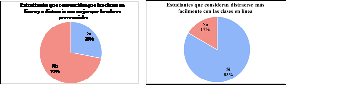 Dadas a las limitaciones de no contar con tecnología y herramientas digitales para participar en clases en línea, solo 2 de cada 10 estudiantes (21%) están convencidos que las clases en línea y a distancia son mejor que las clases presenciales. Esto se corresponde al 64% de los estudiantes que manifestaron carecer de equipos tecnológicos especializados, por lo que preferían estar en clases presenciales.