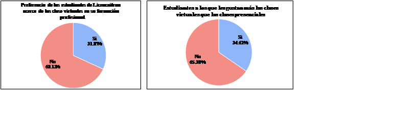 En este sentido, la aceptación del aula invertida por los estudiantes de licenciatura se observa en el momento que ven un mayor rendimiento y aprovechamiento en su aprendizaje y desarrollo de competencias; no obstante, todavía son pocos los estudiantes con un orden de preferencia hacia el aula invertida o clases virtuales, ya que solo 3 de cada 10 prefieren tener clases virtuales en lugar de clases presenciales.