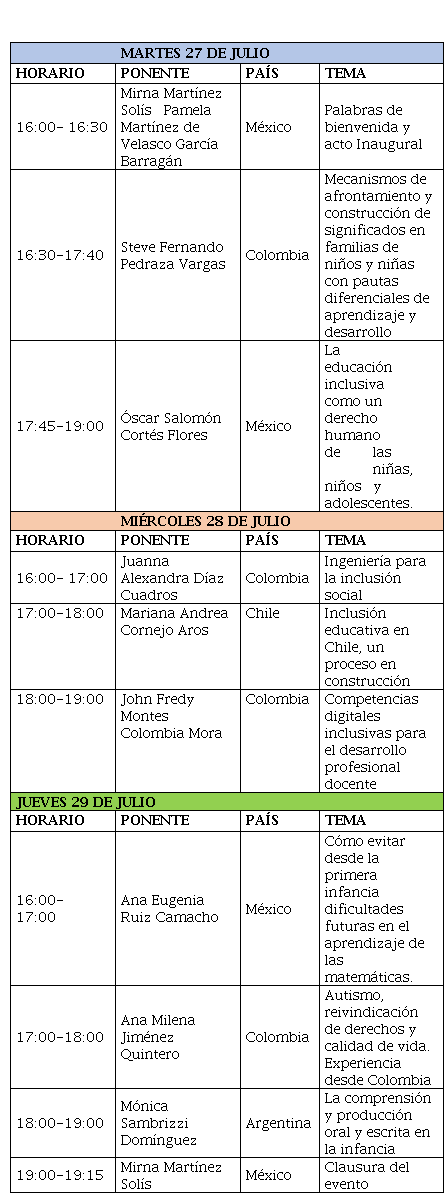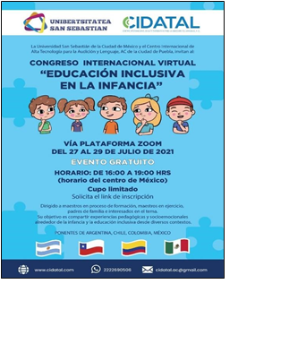 El primer congreso internacional virtual “Educación Inclusiva en la Infancia” se desarrolló en la plataforma Zoom del 27 al 29 de julio de 2021 de16:00 a 19:00 hora del centro de México, la organización fue realizada por la Universidad de San Sebastián de la Ciudad de México y el Centro Internacional de Alta Tecnología para la Audición y el Lenguaje A. C. de la Ciudad de Puebla con la invitación de ponentes de los países de Argentina, Chile, Colombia y México.