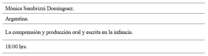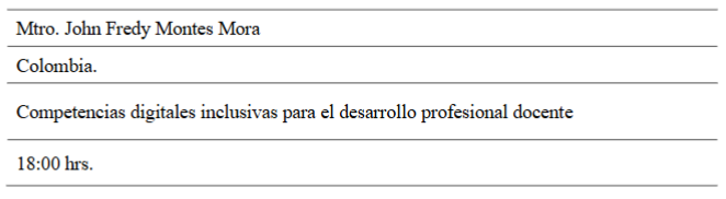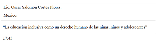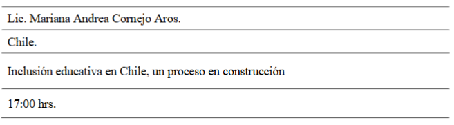 En la disertación se señaló como se ha instalado la inclusión educativa en Chile, sin embargo, esta en un proceso en construcción, la plática se desarrolló en cuatro ejes de análisis: 1) Contextualización educación especial en Chile; 2) De integración a inclusión normativa vigente inclusión educativa; 3) Prácticas favorecedoras para la inclusión educativa; 4) Reflexión final.
