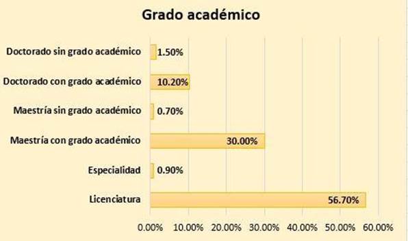 Otro aspecto referente a la formación académica de los docentes señaló que el 56.7% detentan el nivel de licenciatura, el 30% cuenta con el grado de maestría, mientras que sólo el 10.2% cuenta con estudios de doctorado (figura 6).