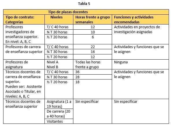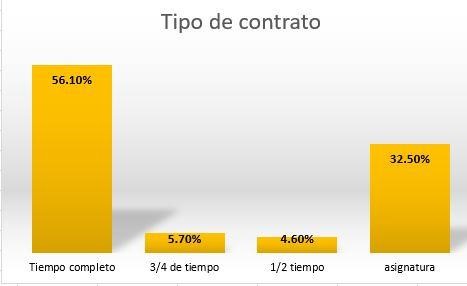 A la par de la formación académica del profesorado, destacó el tipo de contratación que tienen los docentes, luego que su situación laboral está asociada con las horas de enseñanza directa en el aula y las funciones y tareas que le son encomendadas por las autoridades del instituto.