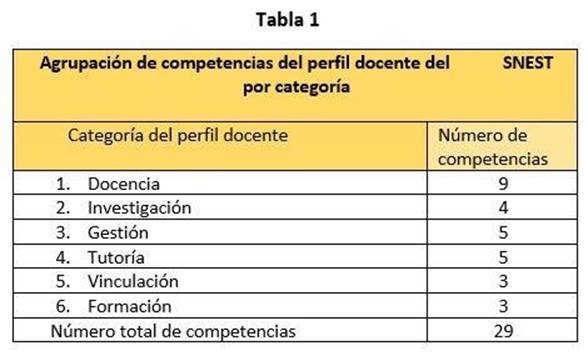Una temática adicional en esta complejidad se relaciona con el Perfil Docente del SNEST que declara, en seis categorías, las 29 competencias que se espera cumplan los profesores. Cada una de esas competencias implica un alto grado de conocimientos, habilidades desarrolladas, actitudes de liderazgo, responsabilidad y compromiso de alta exigencia.