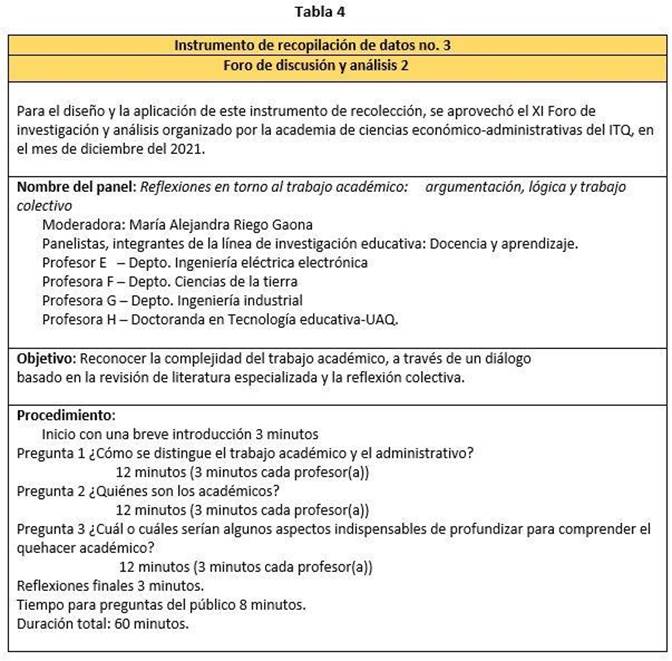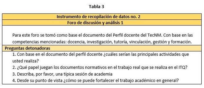 La tercera etapa hizo referencia a la recopilación de datos cualitativos mediante la organización de dos foros de discusión y análisis, con cuatro docentes cada uno. Además, se realizaron cuatro entrevistas semiestructuradas con profesores adscritos a diversas áreas académicas: ciencias económicas administrativas, ciencias de la tierra, ingeniería industrial e ingeniería mecatrónica.
