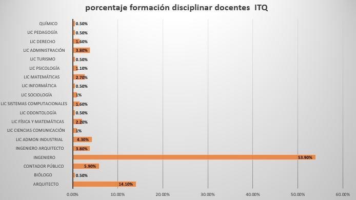 Llamó la atención que la mayoría de los profesores son ingenieros y arquitectos formados en el mismo ITQ. Se puede pensar que, al menos los contratados a tiempo completo, son docentes con poca experiencia profesional disciplinaria, toda vez que, al finalizar sus estudios, dedican su tiempo laboral al instituto tecnológico.