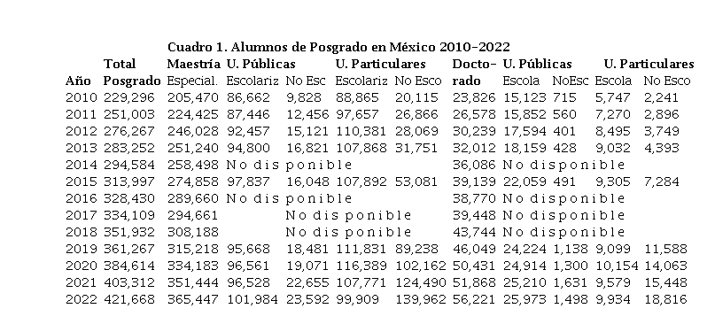 En cuanto a información de la matrícula de posgrado en México, en 1970 se tenían 5,953 alumnos; en 1980: 25,502 alumnos; en 1990: 43,965 alumnos; en 2000: 118,099 alumnos y en 2020: 384,614 alumnos. Con esto se aprecia un crecimiento de 64 veces en la matrícula de alumnos de posgrado en el país, en el período de 50 años: 1970 a 2020.