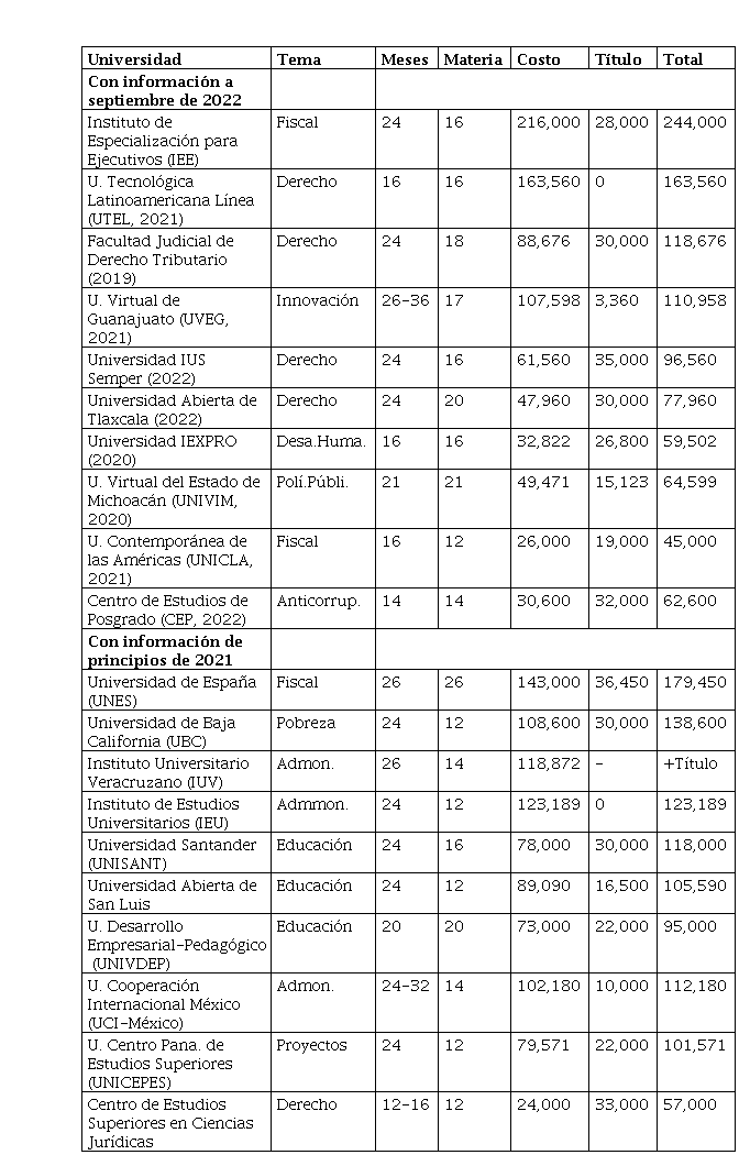 o American Andragogy University (AAU, 2022): con sede en Hawai, Estados Unidos, sus programas de doctorado duran entre 12 y 18 meses, el costo total de la colegiatura es de 7 mil dólares, pero con un descuento lo ofrecían en México en mil 500 dólares (equivale a 30 mil pesos, con tipo de cambio de 20 pesos por dólar).