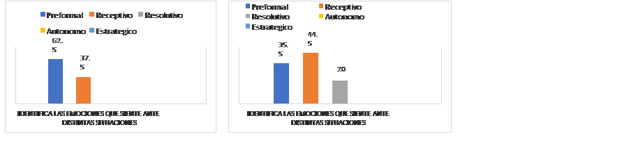 Al inicio de la intervención el 62.5% de los alumnos se encontraban en un nivel preformal, al finalizar la intervención este número se situó en 19%. El nivel receptivo era de 37.5% antes de intervenir, concluyendo la aplicación se ubicó el 65.5% de estudiantes en este nivel y por último se logró que el 15.5 % alcanzara el nivel resolutivo.