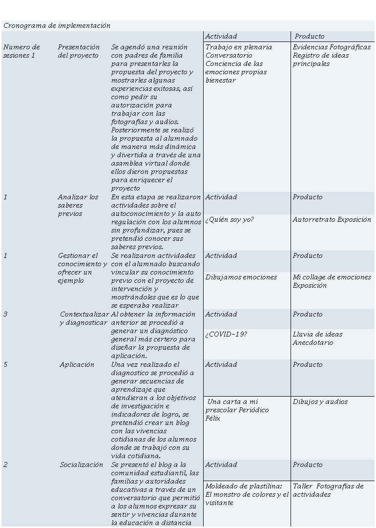 El trabajo consistió en realizar proyectos con los estudiantes para resolver un problema del contexto, en este caso afrontar los problemas emocionales que causa el confinamiento en los alumnos, este proyecto se conforma por los 6 pasos mencionados con anterioridad el cual se aplicó de acuerdo con el siguiente cronograma, plasmado en la tabla 2.