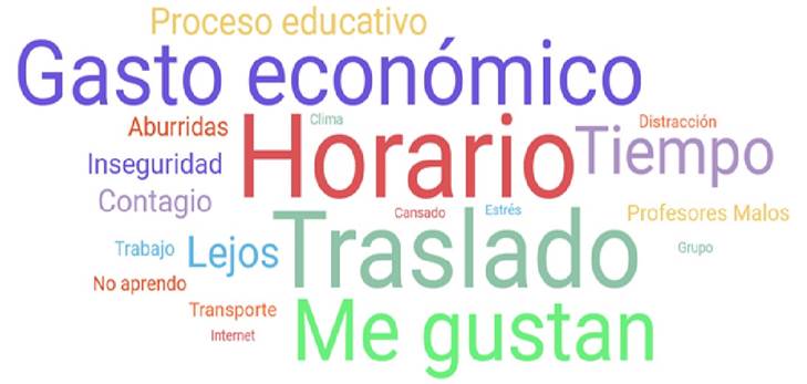 Para entender lo que piensan los estudiantes sobre el regreso a clases presenciales, se realizó una nube de palabras de las respuestas obtenidas a la pregunta ¿No me gustan las clases presenciales por?, por ser una técnica de visualización flexible que permite presentar una visión general a los términos más relevantes. En la figura 1 se observa que el traslado (0.16), el horario escolar (0.15) y el gasto económico (0.12), son las respuestas que obtuvieron una mayor frecuencia. Considerando que la educación en línea obligada por el confinamiento trajo consigo algunos beneficios como ahorro de tiempo y dinero en el desplazamiento (Reyes Soto, 2020; Rodríguez García, 2020), que son dos aspectos que los estudiantes consideran ante el regreso a clases, las dificultades que se tienen a la hora del traslado, que la universidad se encuentra lejos, la falta de transporte, el tiempo que se invierte en el mismo, y el consiguiente gasto económico para los pasajes y en algunas ocasiones la alimentación; aunado con la preocupación por el contagio y la inseguridad. Cabe resaltar que el 0.12 prefiere las clases presenciales por las prácticas, la convivencia y que pueden resolver dudas o simplemente porque se puede aprender y comprenden mejor los temas.
