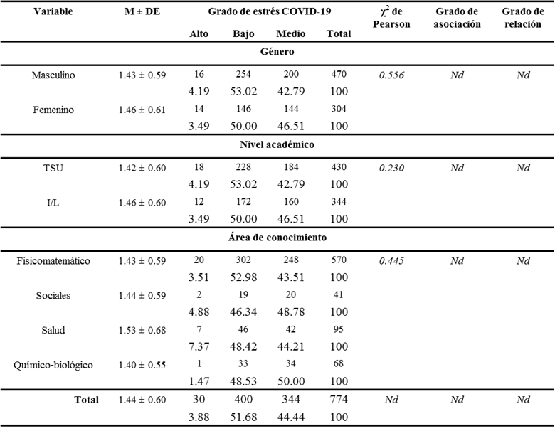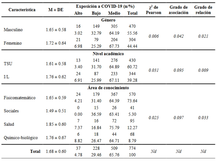 A través de los resultados estimados por variable dependientes, se efectuaron clasificaciones por nivel (bajo, medio y alto) para Exposición a COVID-19, grado de estrés y grado de resiliencia. Mientras que para nivel de compromiso se catalogaron cuatro niveles; bajo, moderado, intermedio y alto. Para todas las variables se tomó en cuenta la restricción de la prueba Chi-cuadrada que indica que todos los criterios deben tener de cinco a más observaciones (Lloret-Segura et al., 2014).