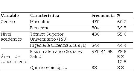 El presente estudio se desarrolló considerando como población objetivo a los estudiantes inscritos en la Universidad Tecnológica del Valle de Toluca, no importando la carrera o el nivel de estudios que estos cursan. La muestra de estudio incluyó tanto estudiantes de nivel Técnico Superior Universitario (TSU), como de Ingeniería o Licenciatura (I/L). Después de depurar la información a datos válidos, la muestra quedó distribuida en 56% de nivel TSU y 44% de licenciatura con un total de 774 estudiantes que contestaron la encuesta. De acuerdo con el área del conocimiento por carrera y el género, la muestra se distribuyó como se indica la Tabla 1. La edad promedio es de 20.48 ± 2.51 años con un rango de 17 a 47.