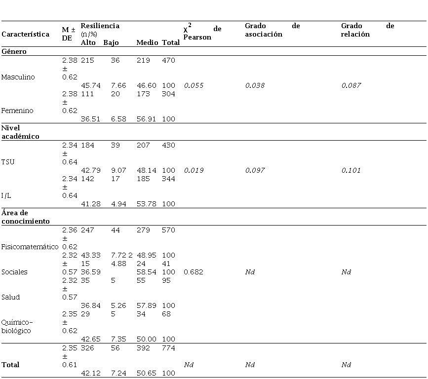 Como se indica en la Tabla 5 el grado de resiliencia está ligeramente asociado al género (P = 0.055) y al nivel académico (P = 0.019), pero no al área de conocimiento de la carrera (P = 0.682). De acuerdo con el recuento, los hombres muestran una mayor resiliencia que las mujeres, así como los de nivel TSU comparado con los de nivel licenciatura. Con respecto al género en un estudio realizado en 2021 en estudiantes de la Universidad Autónoma del Estado de Morelos, observaron este fenómeno, lo que contrasta con diversos estudios en donde se ha encontrado que las mujeres son más resilientes y asumen que los varones pueden tener un mayor dominio al enfrentarse a los contratiempos, que aunque actualmente no encontramos en una sociedad cada vez más igualitaria, se tendrían que realizar más estudios al respecto (Gómez Esquivel et al., 2021).