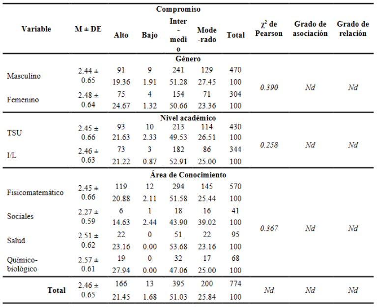 En un estudio reportado en 2010, empleando análisis factorial exploratorio obtuvieron 2 dimensiones (predisposición a estudiar y satisfacción), este trabajo se observó mediante el análisis por componentes, la agrupación de 2 dimensiones: la vitalidad y la dedicación (Jorquera Gutiérrez & Guerra Díaz, 2021). De acuerdo con las pruebas de Xi2, este es totalmente independiente al género, nivel académico y área de carrera (P > 0.05). En la Tabla 4, se describen los conteos y pruebas estadísticas del nivel de compromiso, destaca que los alumnos solo se sienten comprometidos en un nivel de moderado a intermedio.
