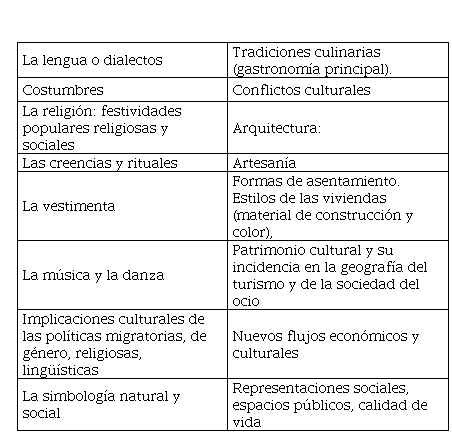 Actividades que el estudiante tiene que realizar: El alumno recopilara la información constitutiva del paisaje cultural según criterios de la GC. Identificara las estructuras espaciales culturales del municipio, Aplicara la teoría y métodos de la GC a un territorio. Comentara en clase cuáles son los criterios componentes de la cultura inmaterial que se reflejan en la cultura material y su relación con temas como la marginación y el deterioro del medio ambiente.