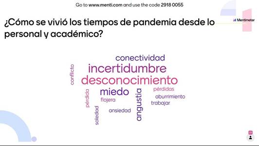 El primer día de clases se desarrollo el encuadre de la Unidad de Aprendizaje, destacando la presentación de los instrumentos de programación didáctica, así como las expectativas que los estudiantes tienen respecto del curso-taller. En una segunda sesión se planteo la cuestionante de cómo vivieron el tiempo de pandemia, solicitándoles que, en una aplicación digital, señalaran con una sola palabra, lo que les significó o represento esta pandemia en su vida personal y académica.