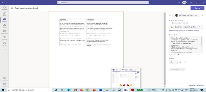 Cuadro comparativo entregado por Ricardo, el cual consideraba el 50% de la evaluación del primer parcial de la Unidad de Aprendizaje Métodos y Técnicas de Investigación.