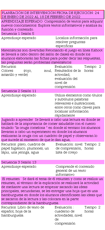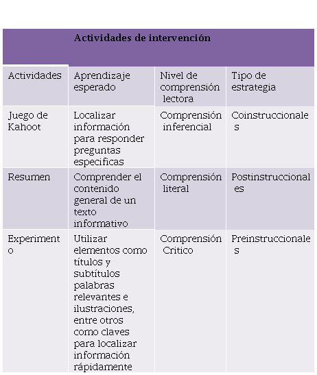 En la tabla anterior se mencionan las actividades de mayor relevancia utilizando los aprendizajes esperados a partir de planes y programas 2017. La intervención se llevó a cabo mediante secuencias didácticas, en el cual consistía en 4 secuencias de 5 sesiones cada secuencia en la cual se tomó en cuenta los temas que van en orden con el plan de trabajo de la profesora frente a grupo. Como se trata de la comprensión lectora se tomó la decisión de tocar todas las materias correspondientes para que se evaluara la comprensión lectora.