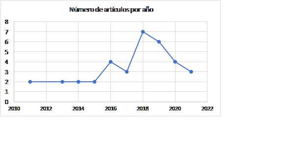 Para comenzar, debe indicarse que de los 35 trabajos revisados entre el periodo de 2011 a 2021 un amplio número de ellos se desarrolló en el año 2018 (gráfica 1).