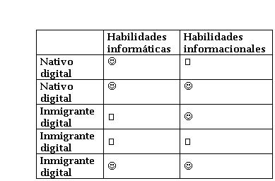 Lo anterior nos lleva a pensar que, aún siendo nativos o inmigrantes digitales pueden poseer o no las habilidades para aplicar el uso de la tecnología hacia el procesamiento de la información y el conocimiento, sin embargo, es el nativo digital quien tiene mayores posibilidades de éxito en términos del desarrollo de habilidades informacionales apoyadas en habilidades informáticas, observemos la siguiente matriz:
