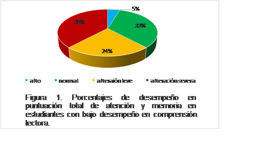 El objetivo de esta investigación fue medir el nivel de atención y memoria en estudiantes con bajo desempeño en comprensión lectora. En base a este planteamiento se realiza el análisis de los hallazgos. Se midió el nivel de las funciones cognitivas de atención y memoria en estudiantes con bajo desempeño en comprensión lectora, los resultados indican, que el 62% presenta alteraciones de leve a severa en las funciones cognitivas de atención y memoria.