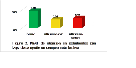 Los datos encontrados del desempeño de atención en los alumnos con bajo nivel de comprensión lectora, el 52% presenta una alteración de leve a severa, en aportaciones de Jian y Farquharson que la atención comportamental influye más en la comprensión auditiva y de forma indirecta en la comprensión lectora (Jian and Farquharson, 2018). Rangel destaca la importancia de la orientación y el enfoque de atención visual en la lectura (Rangel, et al, 2015). Por lo que se describe la importancia de la atención y memoria en la comprensión lectora.